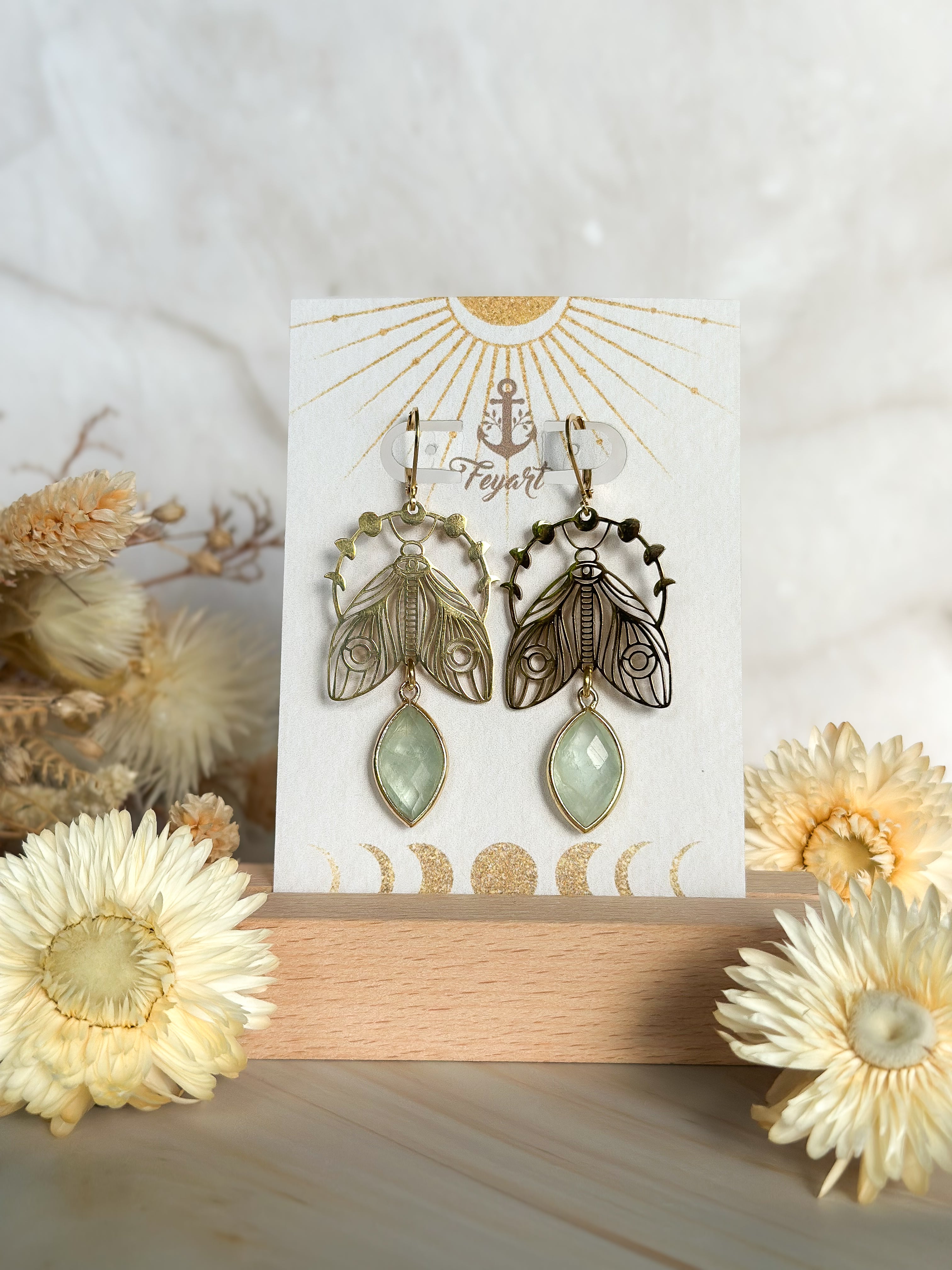 Diese mystischen Ohrringe zeigen ein kunstvoll gestaltetes Nachtpfauenauge – eine der schönsten Motten der Nacht. Über ihr erheben sich die Mondphasen, die den ewigen Kreislauf von Wandel, Licht und Schatten symbolisieren.