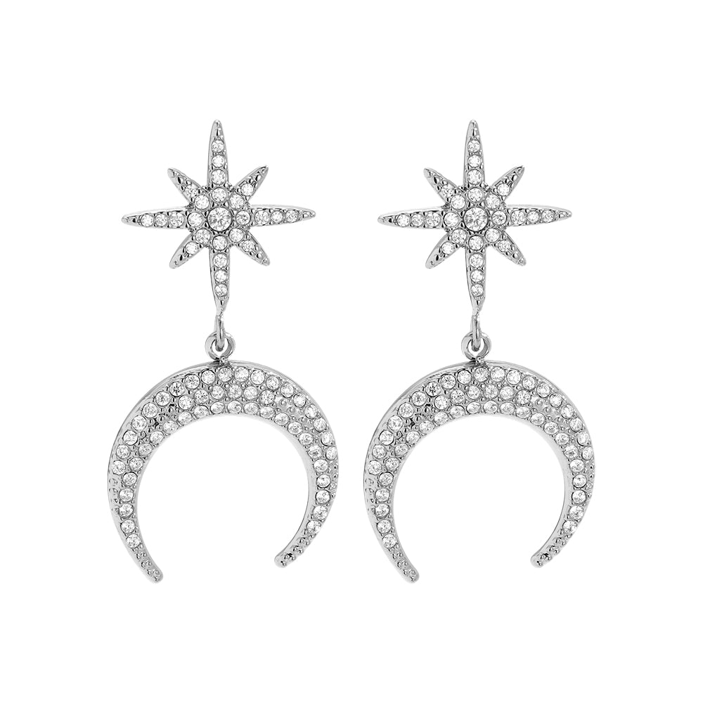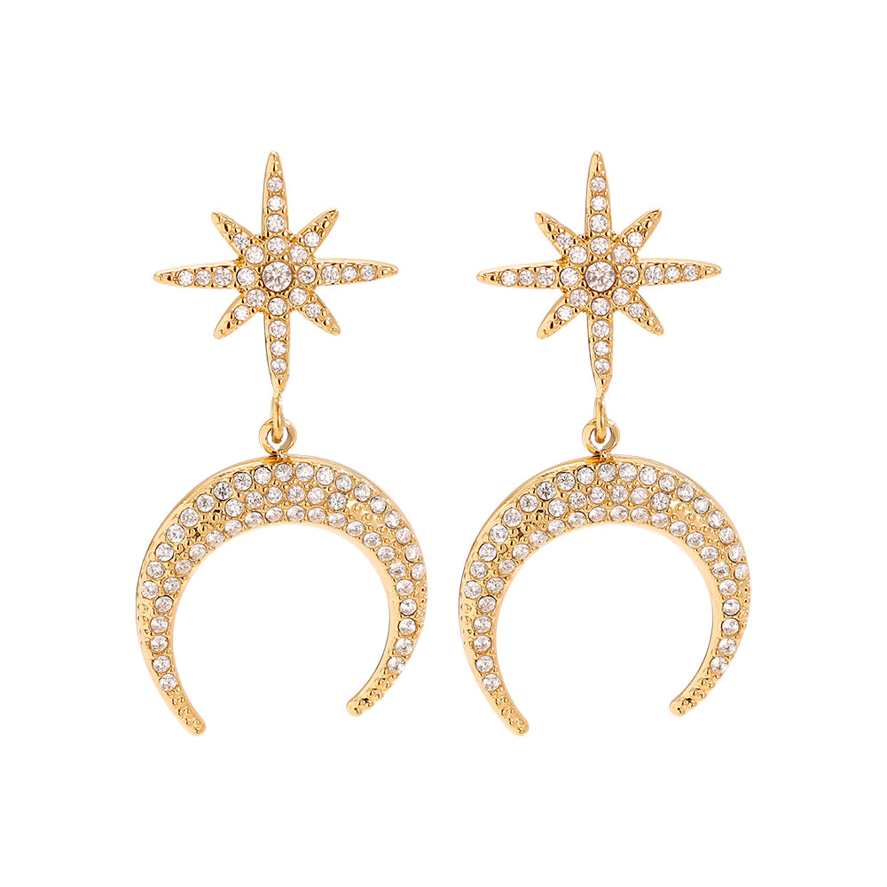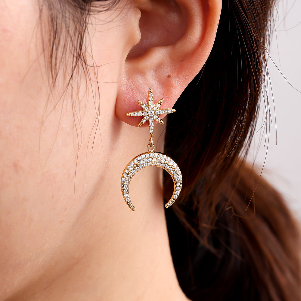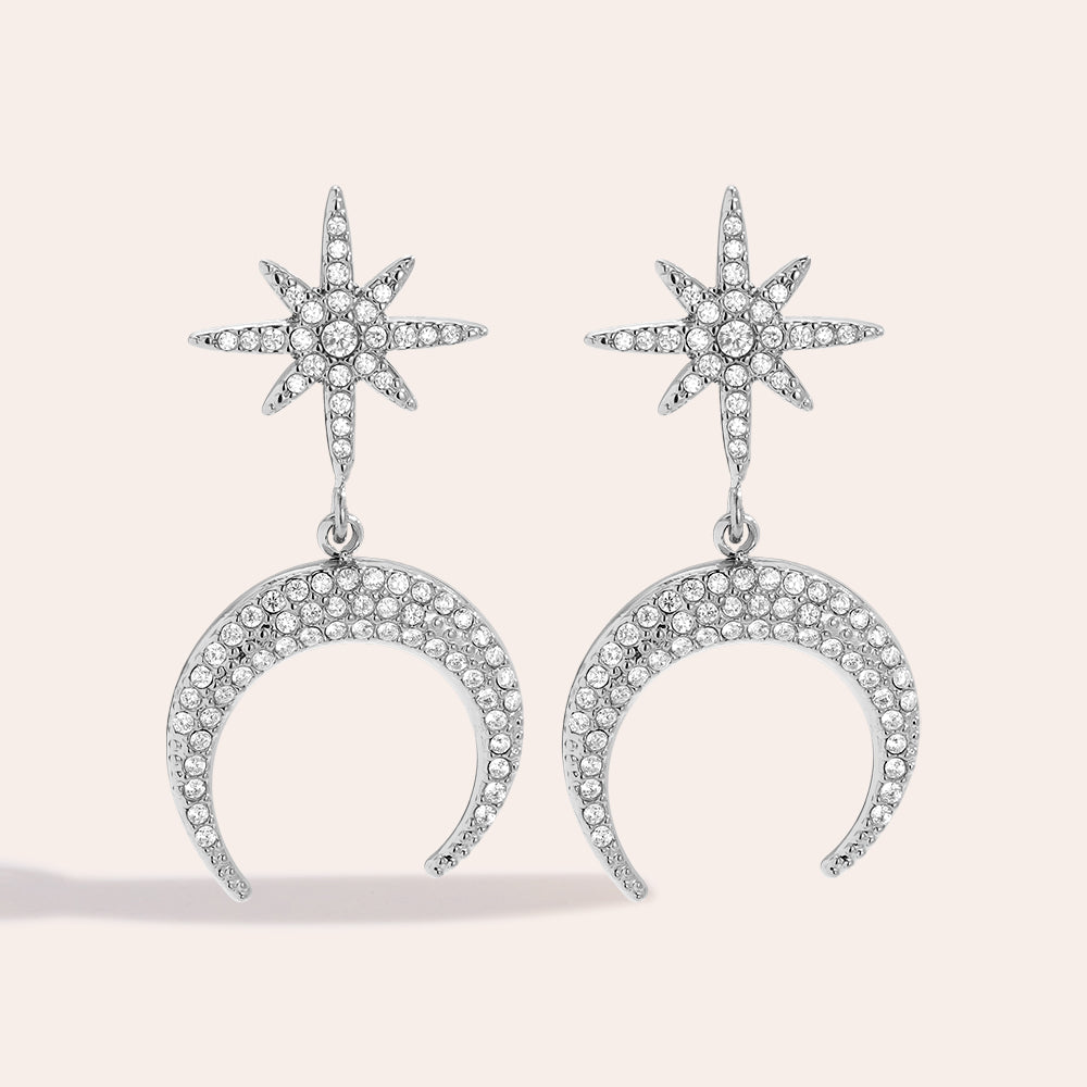 RichtigDiese himmlischen Ohrringe vereinen strahlende Eleganz mit einem Hauch von Magie: Ein funkelnder Stern bildet den Ohrstecker, darunter schwingt ein fein gearbeiteter Halbmond – beide vollständig besetzt mit klaren Zirkonia-Steinen, die bei jeder Bewegung wie Sternenstaub glitzern.
